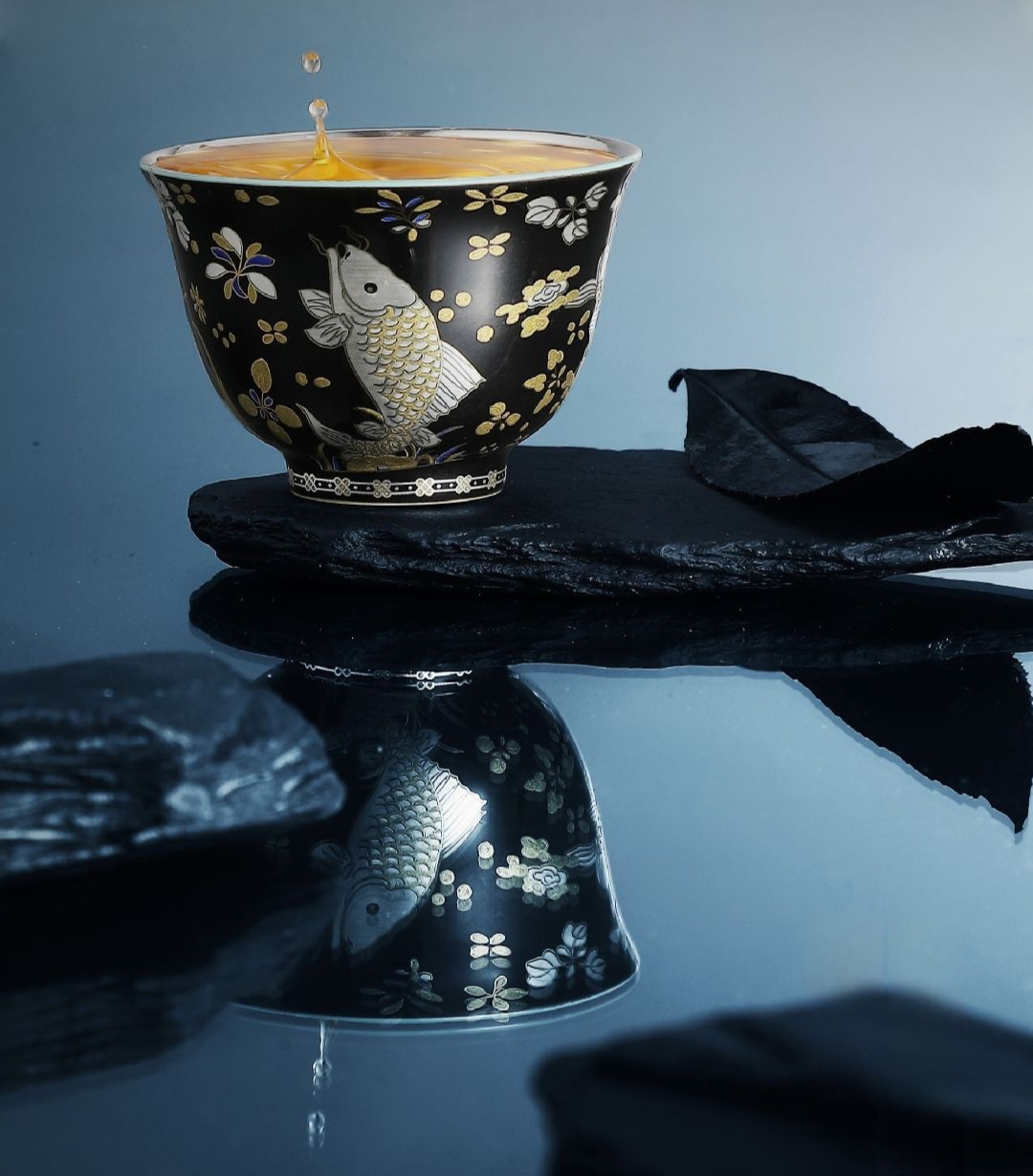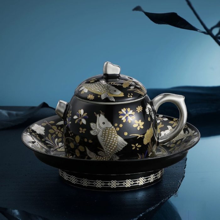 Featuring delicate inlays of gold and silver, this tea set is a symbol of abundance and longevity. The fish and algae motifs, traditionally associated with prosperity, are meticulously carved and inlaid, making this set a true collector’s piece. The contrast between the sleek silver and the intricate gold detailing makes it a stunning centerpiece for any tea lover’s collection, blending traditional Chinese symbolism with modern luxury.